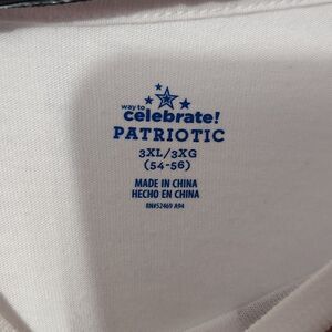 White t-shirt with bold red, white, and blue graphic text. Perfect for showing your patriotic spirit.