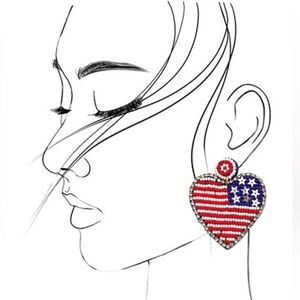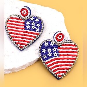 Red, white, and blue heart earrings with beaded design. Perfect for festive occasions.
