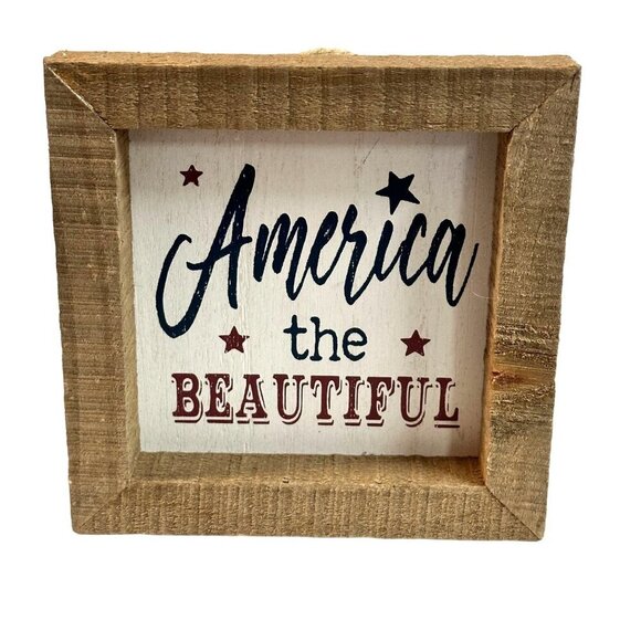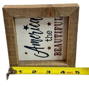 Patriotic home decor piece featuring "America the Beautiful" on a rustic 4x4 inch wood sign. Small framed artwork perfect for adding a touch of patriotism to any room.