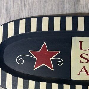 Celebrate your love for the USA with this patriotic oval wall plaque. Featuring bold red, white, and blue colors, it's perfect for adding a touch of Americana to your home decor. Ideal for any room, this accent piece proudly displays your patriotic spirit.
