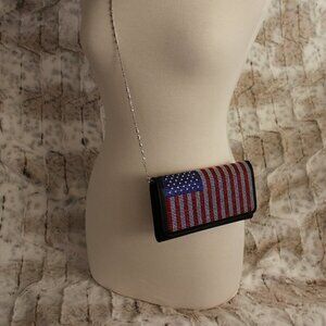 USA Flag Rhinestone Clutch Crossbody Bag 7.5"L x 4"H x 1.25"W Interior zip divider pocket, multiple currency slots & card slots Faux leather construction Silver hardware Detachable chain shoulder strap Additional Description: Americana, American, United, States, of, America, Territories, Patriot, Red, White, Blue, Flag, Wallet, Compartment, Black, Bling, Sparkly, Evening, Flashy, 4th of July, Independence, Day, Holiday, USA, Celebration, Red, White, Blue, Flag, Stars, Stripes, Betsy, Ross, Please note: Beauty for Ashes Boutique carries t-shirts, worship flags, clothing, jewelry and accessories; many with our trademark brand name 'Beauty for Ashes' - which means God will restore Beauty in place of life's ashes - Isaiah 61:3. None of our items carry literal ashes. Instead, our items carry the blessings of God representing restoration and divine destiny for each individual.