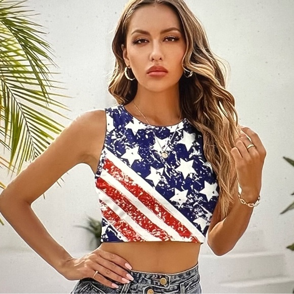 Show off your patriotic spirit with this stylish crop top, featuring bold stars and stripes inspired by the American flag. Perfect for casual outings, festive occasions, or celebrating the 4th of July, this crop tank top adds a fun and bold touch to your wardrobe.