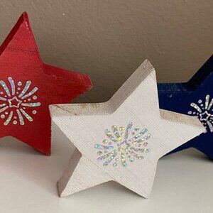 Set includes one white star, one red star, and one blue star. Each star is washed wood embellished with premium quality holographic sparkle vinyl to give the fireworks and sparkle look.