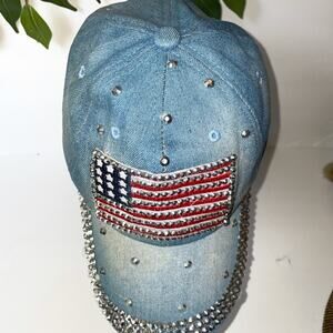 Patriotic USA Flag Blingy Denim Ball Cap Adjustable Rhinestones Streetwear