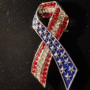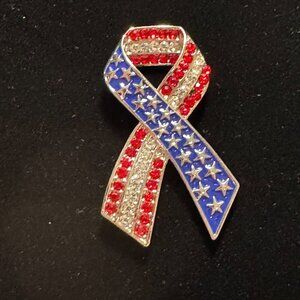 Patriotic USA Flag Ribbon Brooch | Red White Blue Rhinestone Pin | 4th of July
