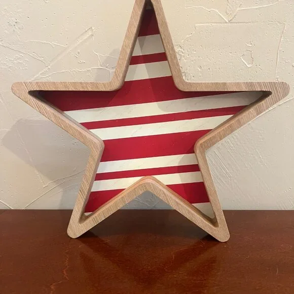 Add a festive patriotic touch to your home with this decorative wooden star featuring classic red and white stripes and a natural wood frame. This Americana-style decor piece is perfect for celebrating Fourth of July, Memorial Day, Veterans Day, or summer seasonal decorating.