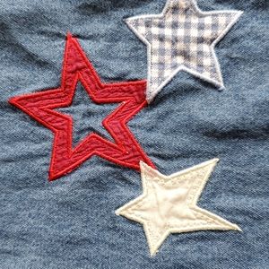 Blair blue jean chambray button down shirt with embroidered stars on front and USA flag on back. Perfect for 4th of July, Independence Daybparty, parade, Voting Day, other patriotic events. Red, white and blue. Size small. 20.5" chest, 26" length.