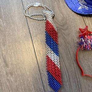 This is for 3 pieces of Patriotic Halloween or any occasion pieces. The Blue sequin hat has several different settings for blinking speed. It has been stored but never worn. The star headband also has multi settings and blinks. It has been worn with the tie once to take a picture. The necktie does not blink. Great for the 4th, election day or any picnic in addition to Halloween. This could even be a duo outfit for people who like to participate in the fun but dont want to go overboard. #patriotichat #patriotictie #lightuphat #sequinhat #patriotichalloweencostume