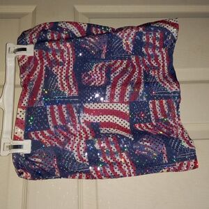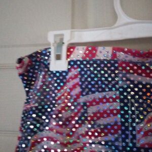 Flags and dozens of iridescent silver spangled cover this stretchy mini, made of bathing suit type Strong & good for beach material. Spangled to stay!! π π heavy but soft wider "waistband" sits low on a sz small. "No Size" but snug on a small/medium!!