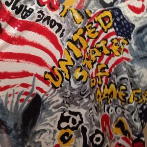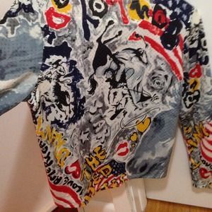Given to me from a friend. Never worn by me though, since it's just a little too wild for my taste. Little translucent sequin things covering it, many American flag prints. If you want to be patriotic and trendy AT THE SAME TIME, then here is the shirt for you.