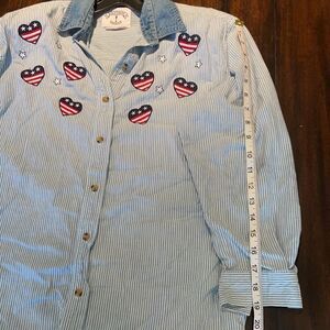 Red white blue American flag patriotic heart design on a white and blue pinstripe collared shirt