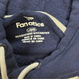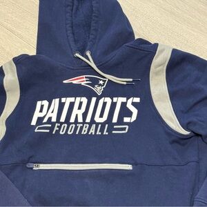 New England Patriots Hoodie by Fanatics. Features gray drawstrings and accents.