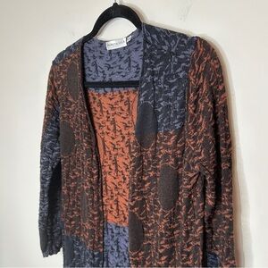 This long cardigan features an abstract pattern in black, brown, and blue. Perfect for layering.