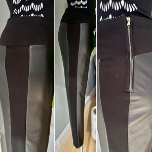 Paneled vegan leather pants have knit panels on the side and inseam of the legs with vegan leather panels on the front and back of the legs.