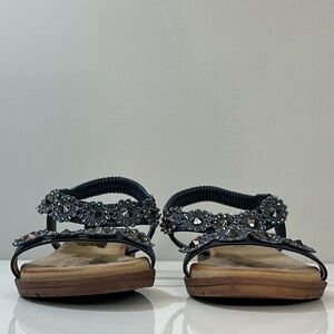 The T-strap is embellished with rhinestones and studs for a standout style, while the well-padded comfort footbed provides cushioning support. Synthetic upper sling back elastic strap. Round open toe synthetic lining. Faux leather padded foot bed.