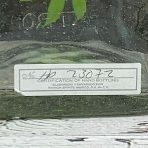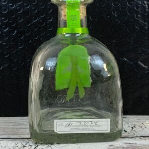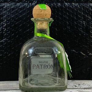 Collectible empty Patron Silver tequila bottle, a distinctive piece for home decor or barware collections. This bottle features the iconic Patron design, complete with its original cork stopper and green ribbon accent. The bottle is marked with a "Certification of Hand Bottling" label, adding to its unique appeal. A great item for collectors or those looking to repurpose it for creative projects.