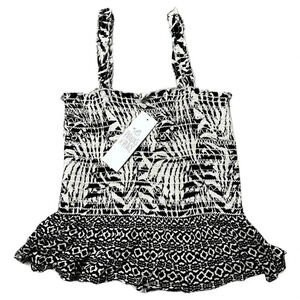 The top is made of lightweight rayon material and has a smocked peplum design for added structure. The pullover closure makes it easy to wear, while the ruffle and strap accents give it a unique and playful look. This top is available in size medium and is perfect for anyone who loves bohemian, peasant, or tropical themes.