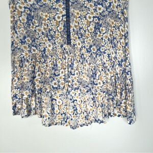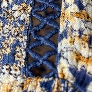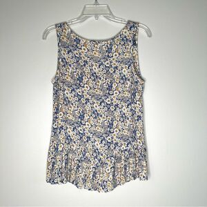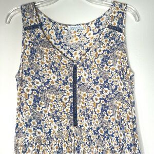 Patrons Of Peace Ditsy Floral Embroidered High Low Sleeveless Blue Gold Blouse