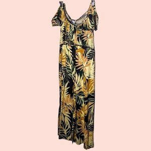 Wide Leg one piece pull on jumpsuit featuring a lively leafy tropical print on black rayon with POCKETS and a puckered short sleeve bodice that could easily be worn off the shoulder. The front has a crossover look and a modest shallow v-neck. Slight umpire elastic ruffle waist. Easy one and done style in forest green, warm golden yellow, pale yellow, peach and black.