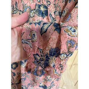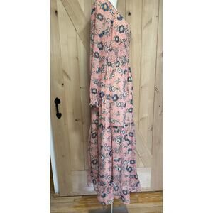 Boho pink and blue floral long sleeve, long dress by Patrons of Peace. Low v neckline with fabric buttons and smocked waist with stretchy material. VERY flattering and comfortable. Sleeves are light with elastic cuffs. Skirt is lined. Beautiful pattern! Great dress for a Fall party, wedding, or festival! See photos for measurements and material content and care.