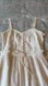 Charming cream maxi dress with delicate spaghetti straps. Features a tiered design and subtle polka dot pattern. Perfect for casual outings.