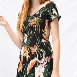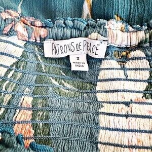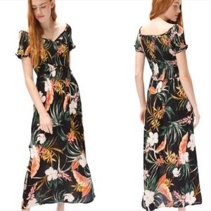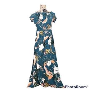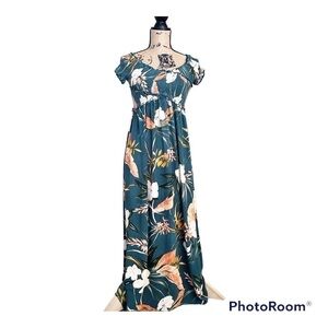 Patrons of Peace Green Smocked Off Shoulder Tropical Maxi Dress.