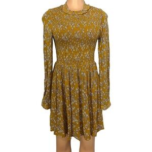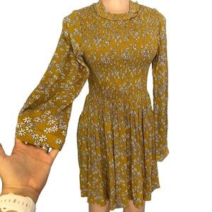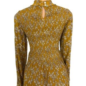 Patrons of Peace High Neck Mustard Yellow Floral Smocked Dress in size Small. Long sleeve modest dress with stretch smocking at the chest.