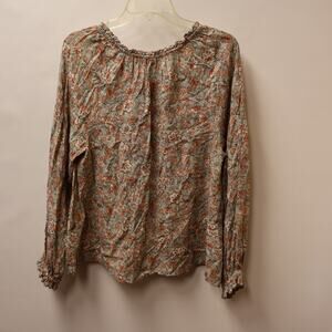 Patrons of Peace Peasant Top Ruffle tie Front, Long elastic cuffs sleeves Sage and Orange Print. Size Large Pullover.