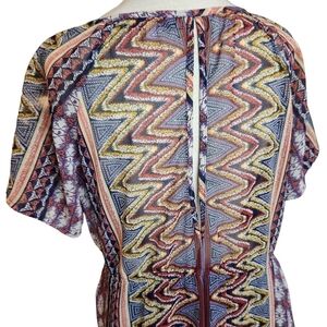 Patrons of Peace multi-color, printed, sheer maxi dress with short lining, button neck on back, and 2 slits.