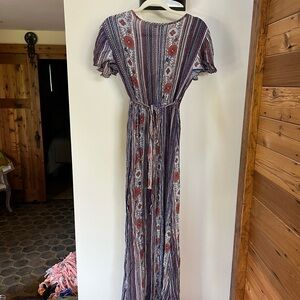 Chic maxi dress with floral and stripe design. Features a flattering wrap style. See close up for pattern :)