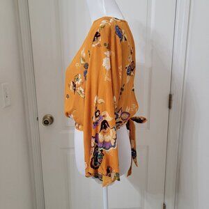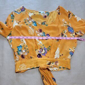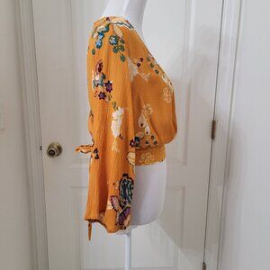 Patrons of Peace Size S Dark Apricot Floral Cropped Tie Back 3/4 Bell Sleeve Top