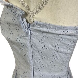 Patrons of Peace Sundress Mini Blue Eyelet Lined Elastic Back Size Small. Excellent condition. Top ruffle, adjustable strap, side zipper, pretty eyelet over lining. 100% cotton. See photos for details and measurements. Wedding, brunch, vacation, beach, summer , spring, feminine, date night
