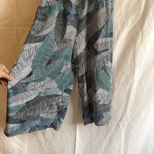 Green/Blue/Black/White patterned (possibly palm, possibly feather) jumpsuit. Smocked bodice with criss-cross front. Off the shoulder design with ruffled sleeves. Cropped wide leg jumpsuit with pockets.