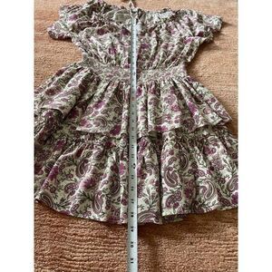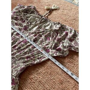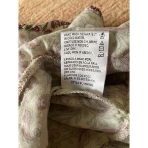 Patrons of Peace women’s boho-style mini dress in size Large, but fits smaller—best for a Medium or a slim Small. Please refer to last photo for fit on model (model usually wears size S/M). Made in India of 100% rayon. Features a mauve and olive paisley floral print, short flutter sleeves, a split neckline with tassel tie, stretchy smocked waist, and double-tiered ruffle skirt. Lightweight and perfect for warm weather. Hand wash cold, line dry. Unlined. In great pre-owned condition. Approximate measurements: pit to pit 19”, length 31”. Style #J1160F03.