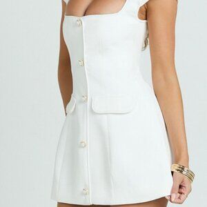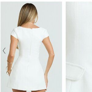 NWOT size 10 Patsy Mini Dress - Boucle Cap Sleeve Button Front Fitted Dress in White Elevate your wardrobe with the Patsy Mini Dress - a figure-flattering marvel that redefines chic simplicity. Perfectly tailored for the modern woman, this white fitted dress is a testament to timeless style and sophistication. Crafted from luxurious boucle polyester, it promises not just comfort but also durability, making it a staple piece you'll reach for time and time again. Product Details: Zips, Buttons Pockets Inner Lining Fitted dresses Boucle fabric Square neckline Party day wear Mini length Short sleeve Polyester material Size and Fit Size S / 8 length: 77cm / 30.31in Material and Care Lining: 100% Polyester Main Fabric: 95% Polyester, 5% Spandex Low Stretch