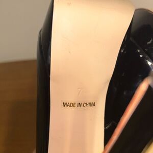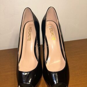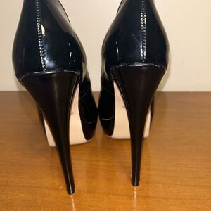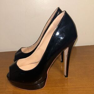 Size 7. Tall 4.5 in heel1.5 in platform. Black pattern leather. Open toe. In excellent condition