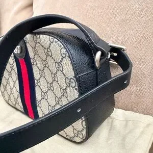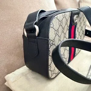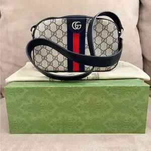 Elegant crossbody. Features red and blue stripe detail. In very good condition.