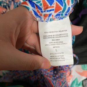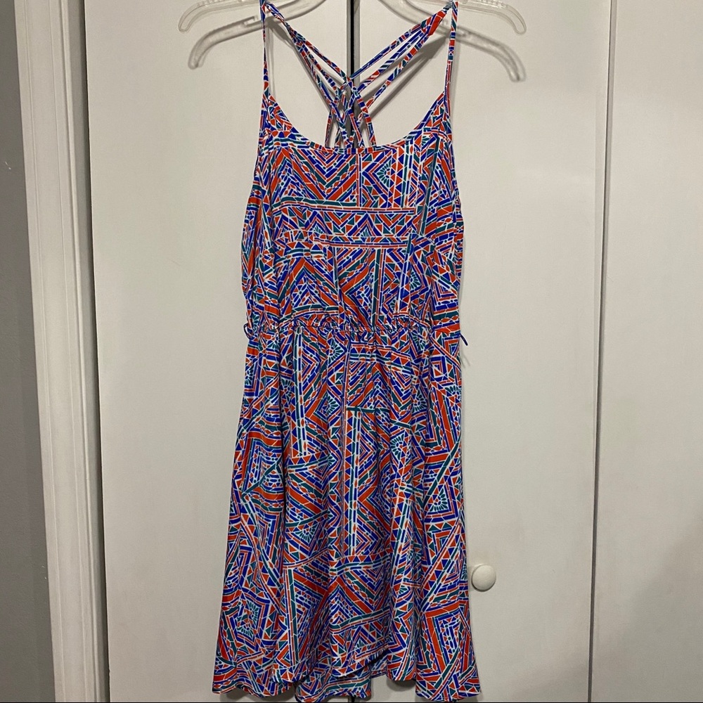Beautiful orange, blue, greenish pattern dress, beautiful design on the back, above the knee, and in very good condition!