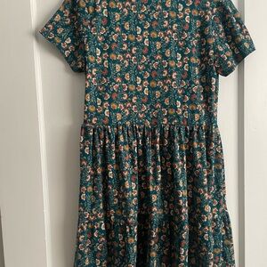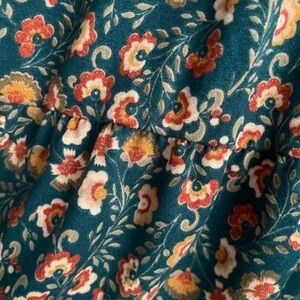 Charming dress featuring a delightful floral pattern. The green and orange colors make it perfect for any occasion. Comfortable and stylish for you or your little one