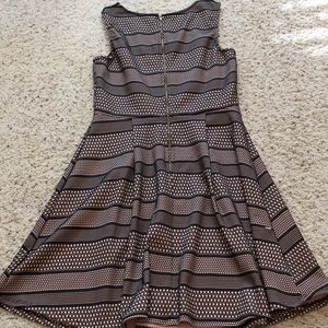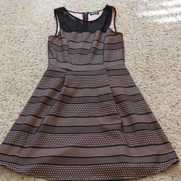 Formal dress with lacy type pattern and shear fabric around the neckline with zipper in the back.