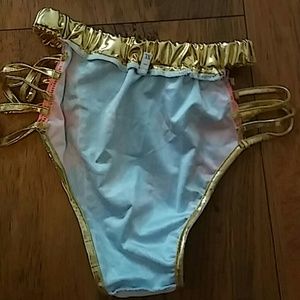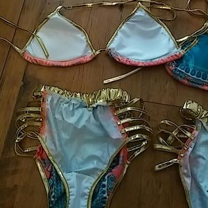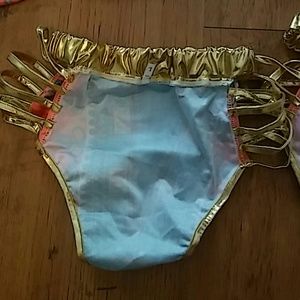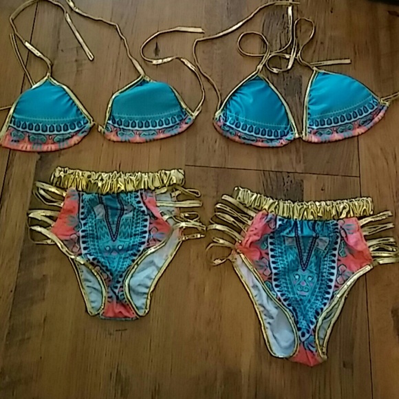 Culture art and gold two piece bikini has light thin fabric water absorbent fabric. Elastic band waist. Stretch. Sizes L and XL available. Large fits M/L and Extra Large fits L/XL