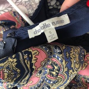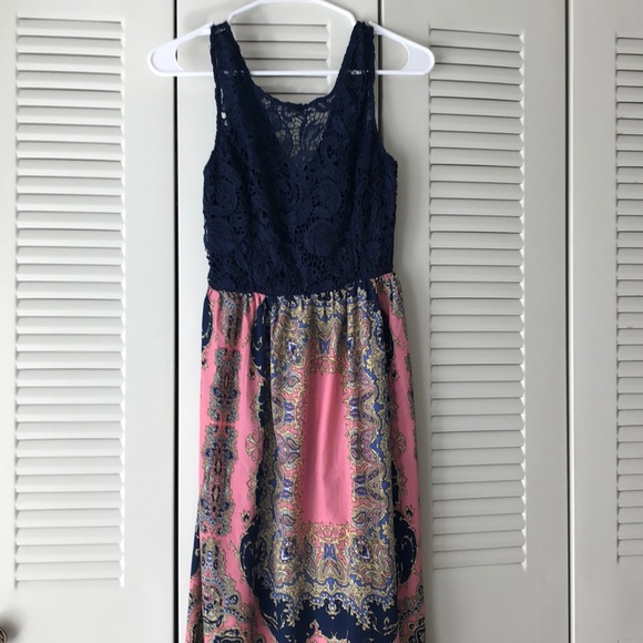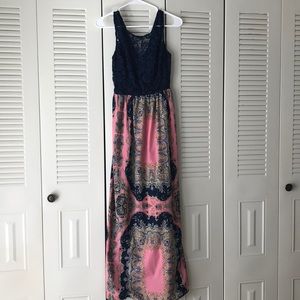Gorgeous patterned maxi dress with navy lace top. Worn a couple times and got tons of compliments, very form fitting!