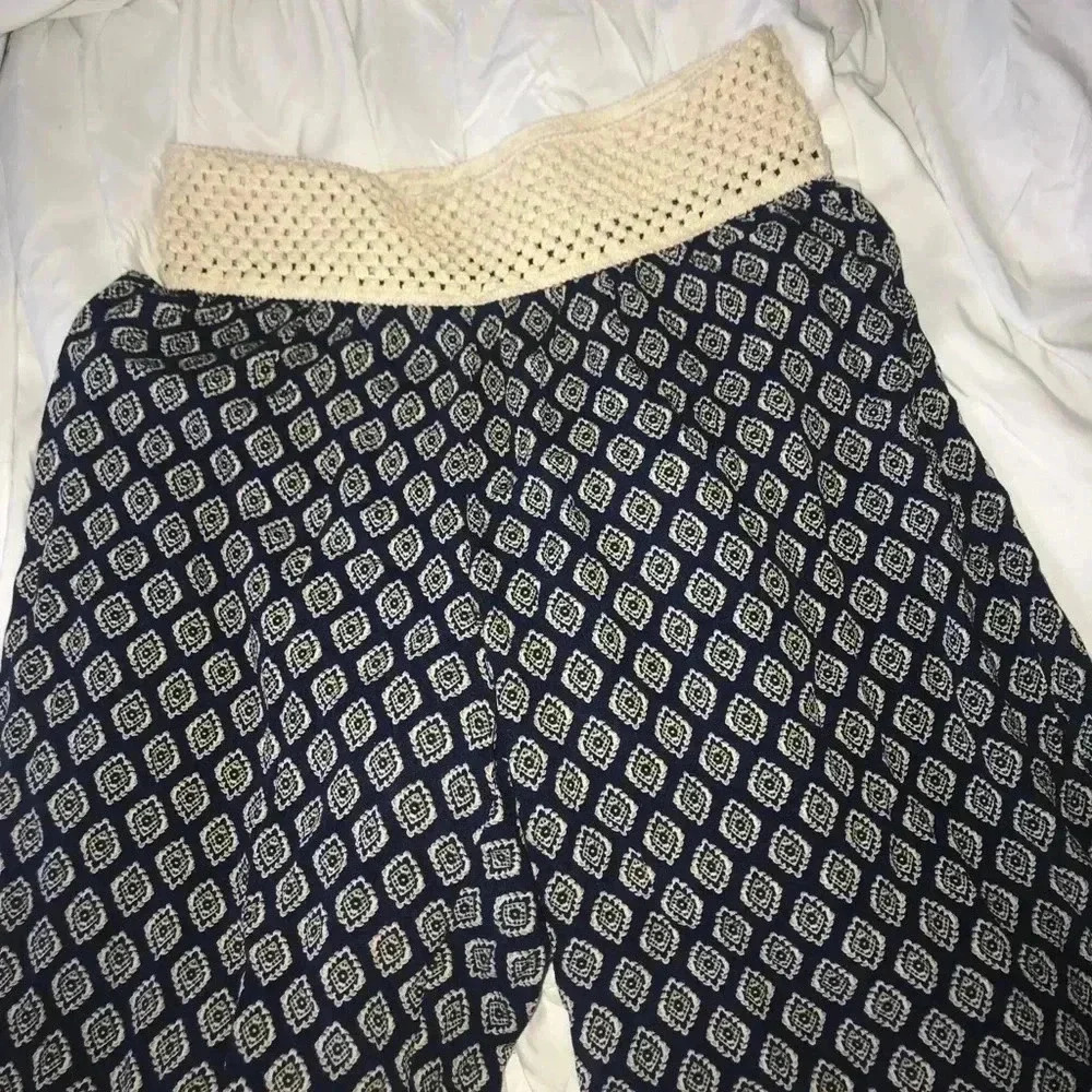 Cream and navy patterned pants. Flare bottoms. Super flowy and lightweight. Crochet waistband. Size large