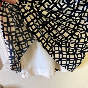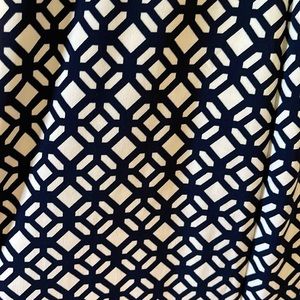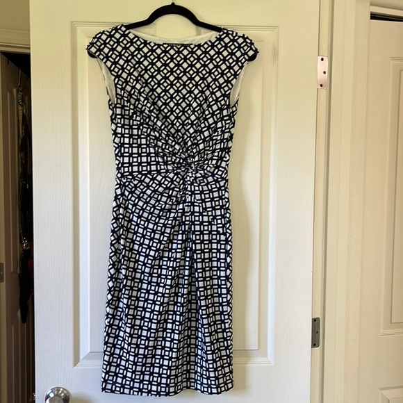 Very flattering dress! Lined on the inside and material is stretchy. Cap sleeves. Hits at about knee length. Pattern is navy and white.
