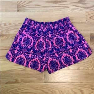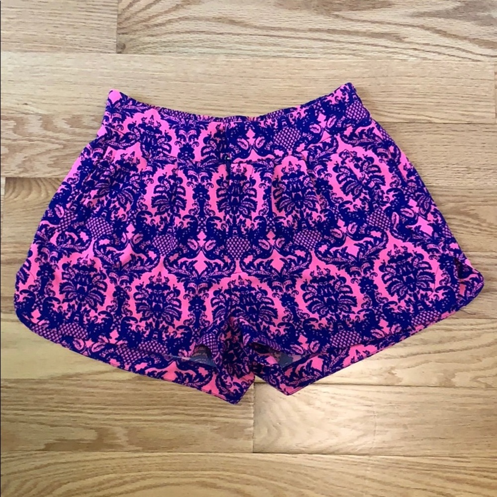 Blue and Pink Patterned Shorts with 2 inch inseam. Back pockets and side pockets