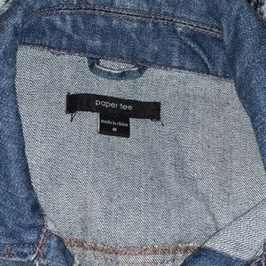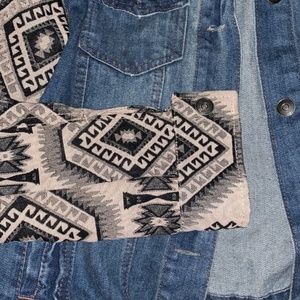 Medium wash Jean Jacket with black and beige pattern on the sleeves that is a canvas/woven like material. This is a size Medium in Women's and is gently used but in great condition! The jacket has no flaws or stains and has all the buttons attached. It has two pockets on the top on either side and two pockets at the waist.