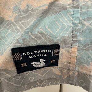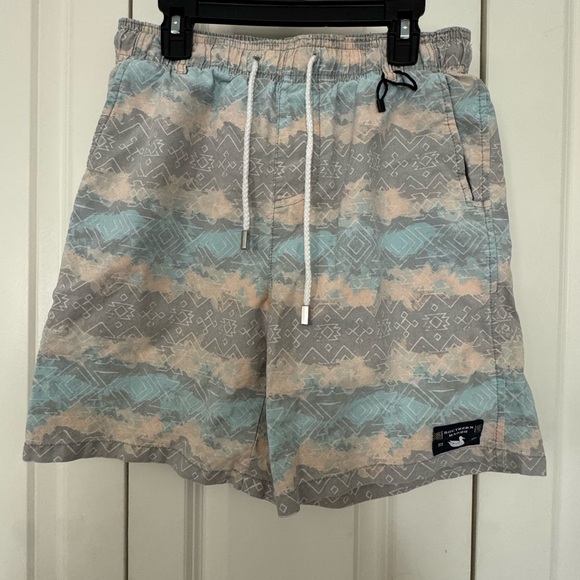 Geometric pattern swim shorts by Southern Marsh. Features a drawstring waist for comfort.