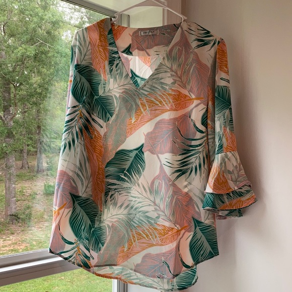 White foliage patterned top with ruffle 3/4 sleeves. Never worn but has been washed.