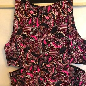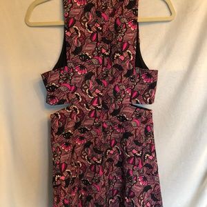 A bright, funky pattern that really catches attention! The dress has cut-outs on the sides and has only been worn once. No flaws! Fits slightly tight, like a 4/6