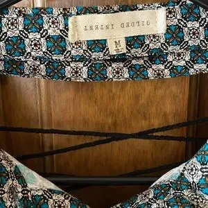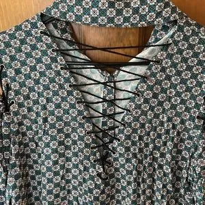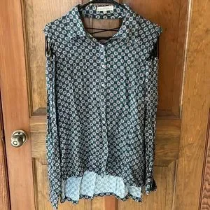Printed button down with fun sleeve and back detail. Loose fit.